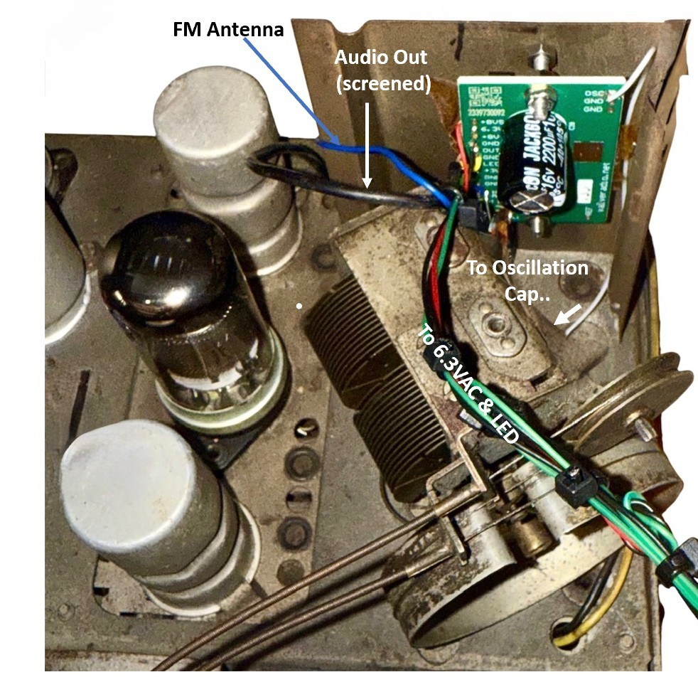 Fig. 15B. FA-4 FM tuner module fitted into an Australian Philips model 125 vintage radio. Gimmick is the white/green striped wire. Antenna post is shared. A decoulping (though practically useless) inductor can be seen on the left, in a clear plastic tube.