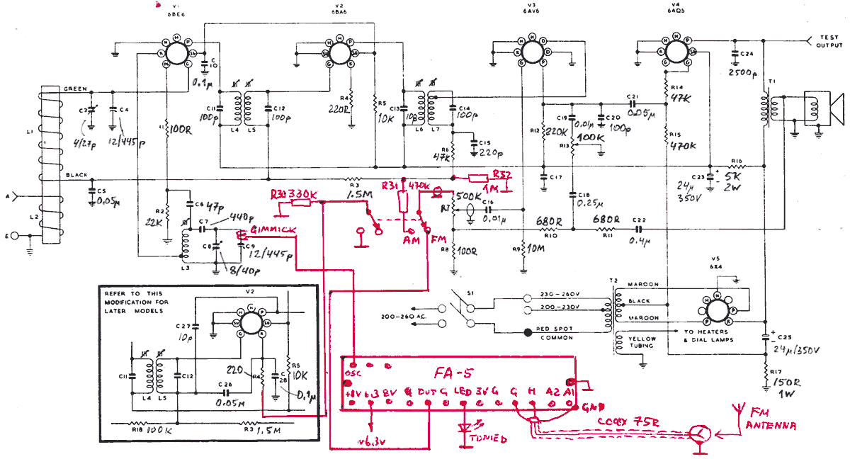 Fig. 16A. Connection of FA-5 to a HMV "Super-5" (model 65) radio. As the first audio stage is integrated with AM detector, it is preferable to mute AM chain in FM mode. It is achieved by shorting screen grid voltage of the IF stage.