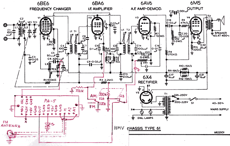 Fig. 16D. Connection of FA-5 to HMV model 61-51 radio. IF stage is muted in FM mode by opening the 6BA6 cathode circuit, but a 330K bleeding resistor helps prevent overvoltage in (an unlikely) case of leakage in the 6BA6 tube. A resistibe divirer 330K/120K at the AM detector equalises volume of AM and FM reception and does not allow AGC circuit "floating" in FM mode.