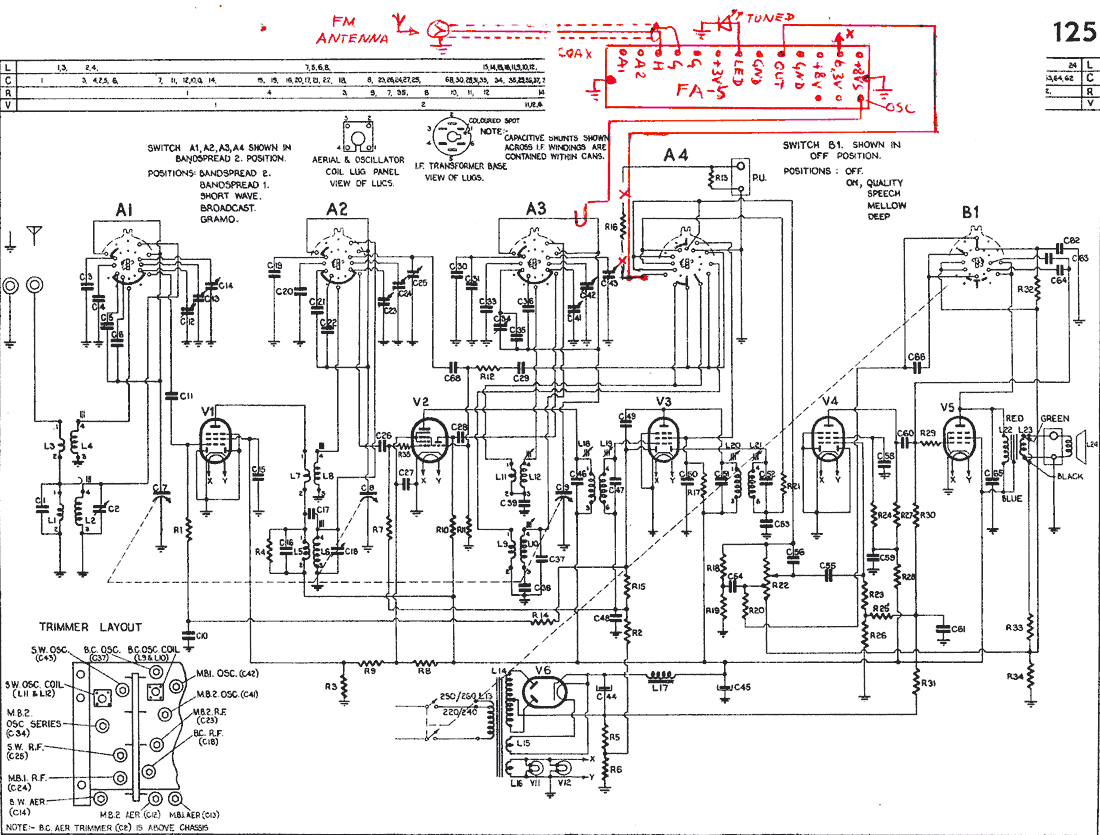 Fig. 16E. Connection of FA-5 to Philips model 125 radio. "GRAMO" position of the band switch is be used to activate FM mode. In this position, fortunately, the local oscillator continues to run as in MW band and further, the AM chain is muted by shorting the IF stage screen grid voltage to ground.